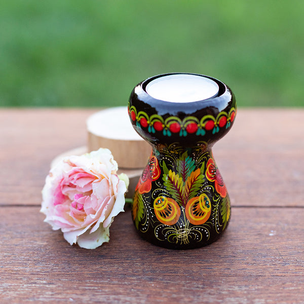 Handmade wooden candlestick with traditional decorative Ukrainian Petrykivka painting.