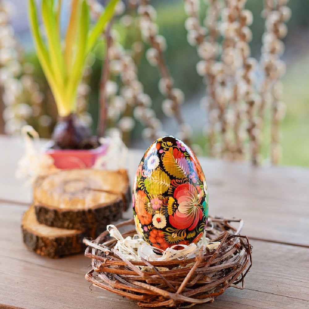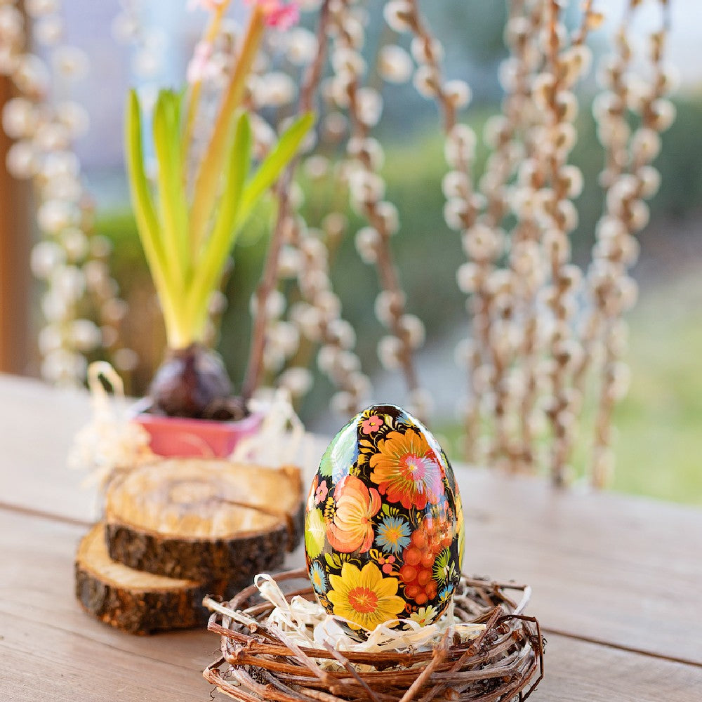 The wooden egg in ostrich egg size (10 cm) is a true work of art that embodies the rich tradition of Ukrainian Petrykiwka painting. With vibrant colors and unique patterns applied by hand, each egg is an irreplaceable masterpiece crafted by skilled artisans.