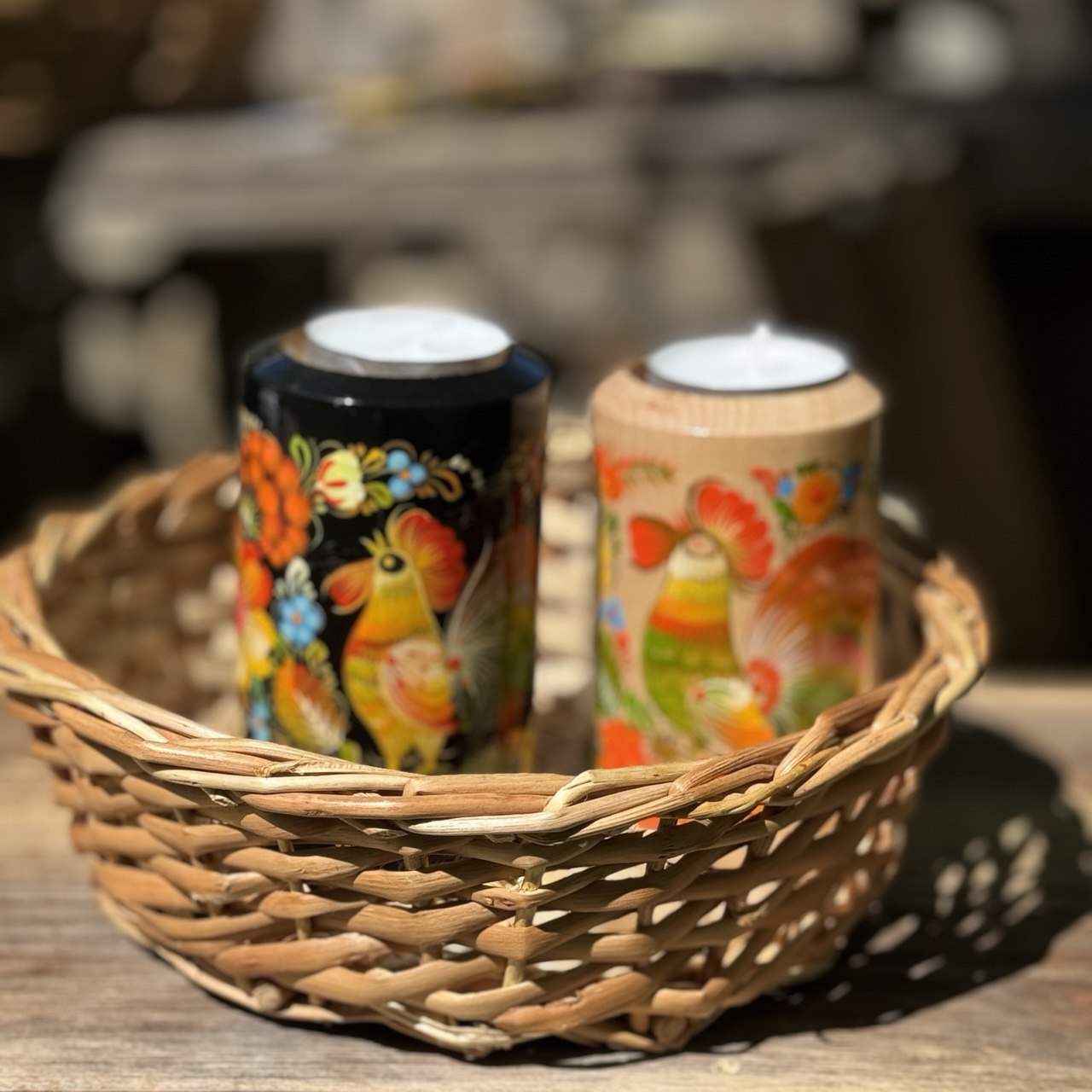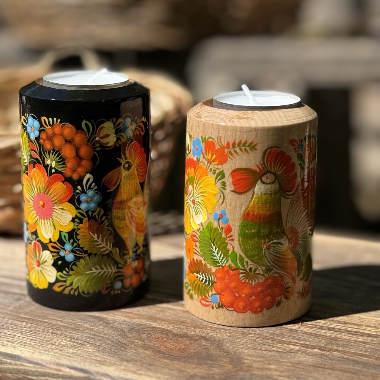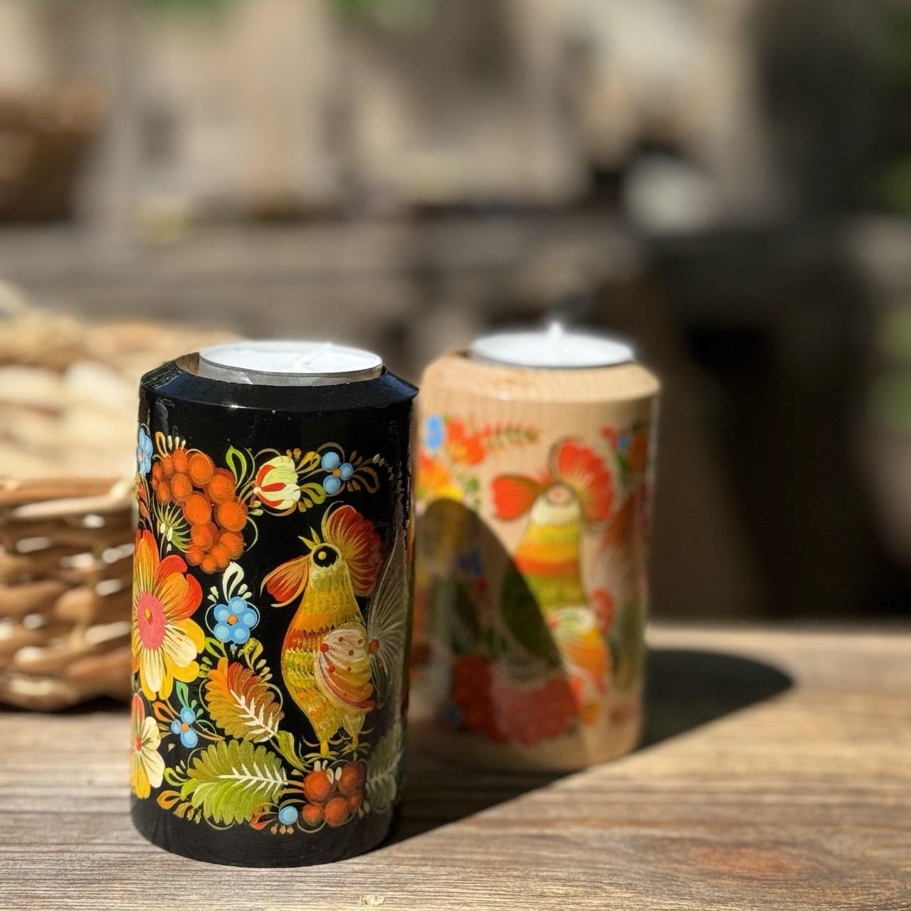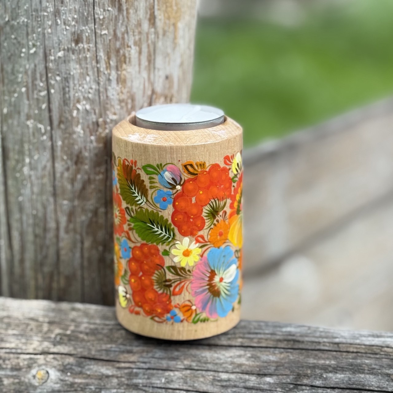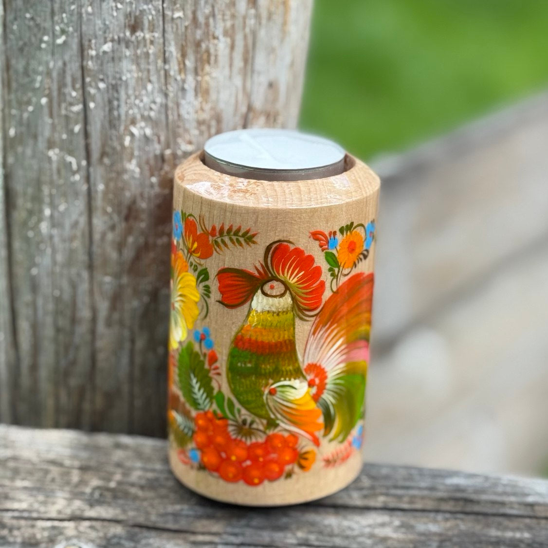 Handcrafted candle holder with traditional decorative Ukrainian Petrykivka painting.