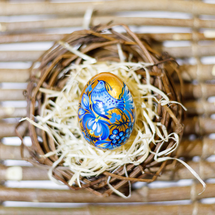 Goldenes Osterei Holz Handbemalt mit Petrykiwka-Malerei